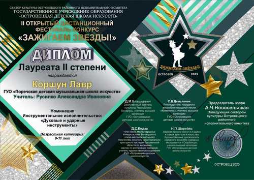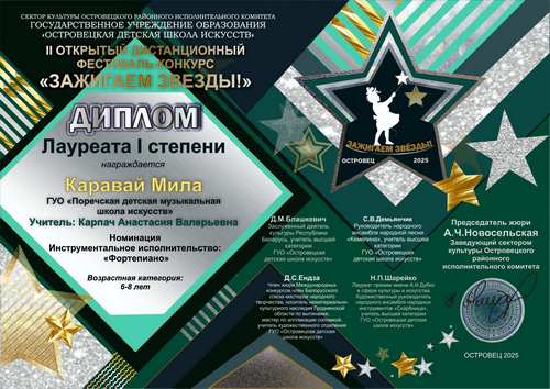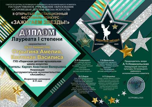 Учащиеся школы искусств приняли участие во II открытом дистанционном фестивале-конкурсе "Зажигаем звезды", который проходил в Островецкой детской школе искусств. Лауреатами I степени в номинации "Фортепиано" стали Каравай Мила, Шайдулова Дарья, в номинации "Ансамбль" дуэт пианистов в составе Костяной Василисы и Стрыгиной Амелии. Лауреатом II степени в номинации "Духовые и ударные инструменты" стал Коршун Лавр. Благодарностью за высокий профессионализм и качественную подготовку участников фестиваля награждены учитель по классу фортепиано Карпач Анастасия Валерьевна и учитель по классу деревянных духовых инструментов Русилко Александра Ивановна.